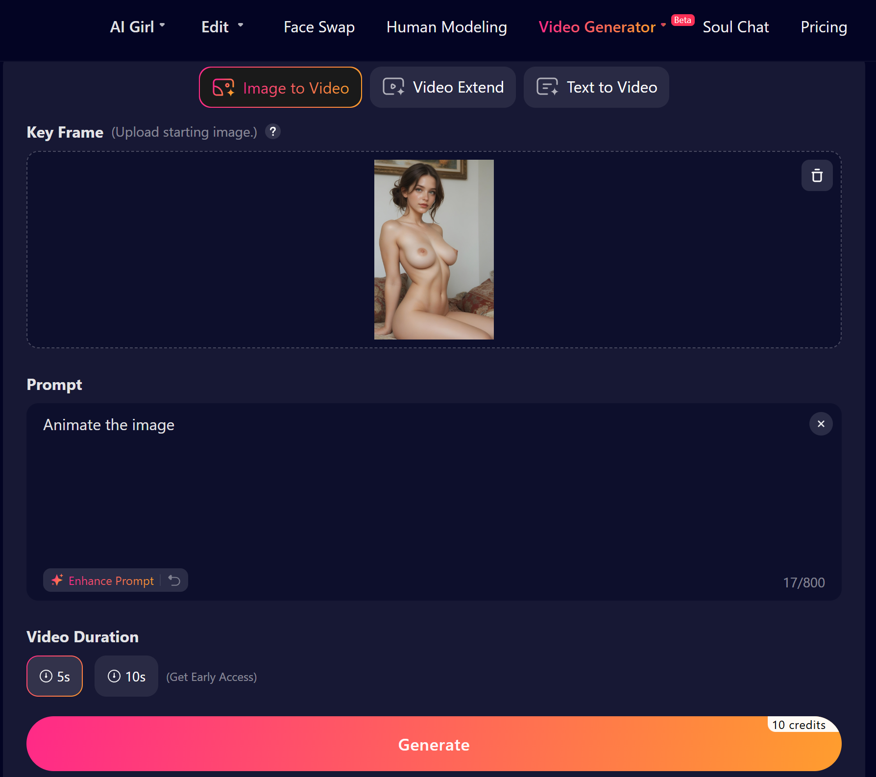 When I’m SoulGen to Create NSFW AI Images I found there is an ‘Animation’ button which you can turn your AI generated image to Video and without any restrictions.